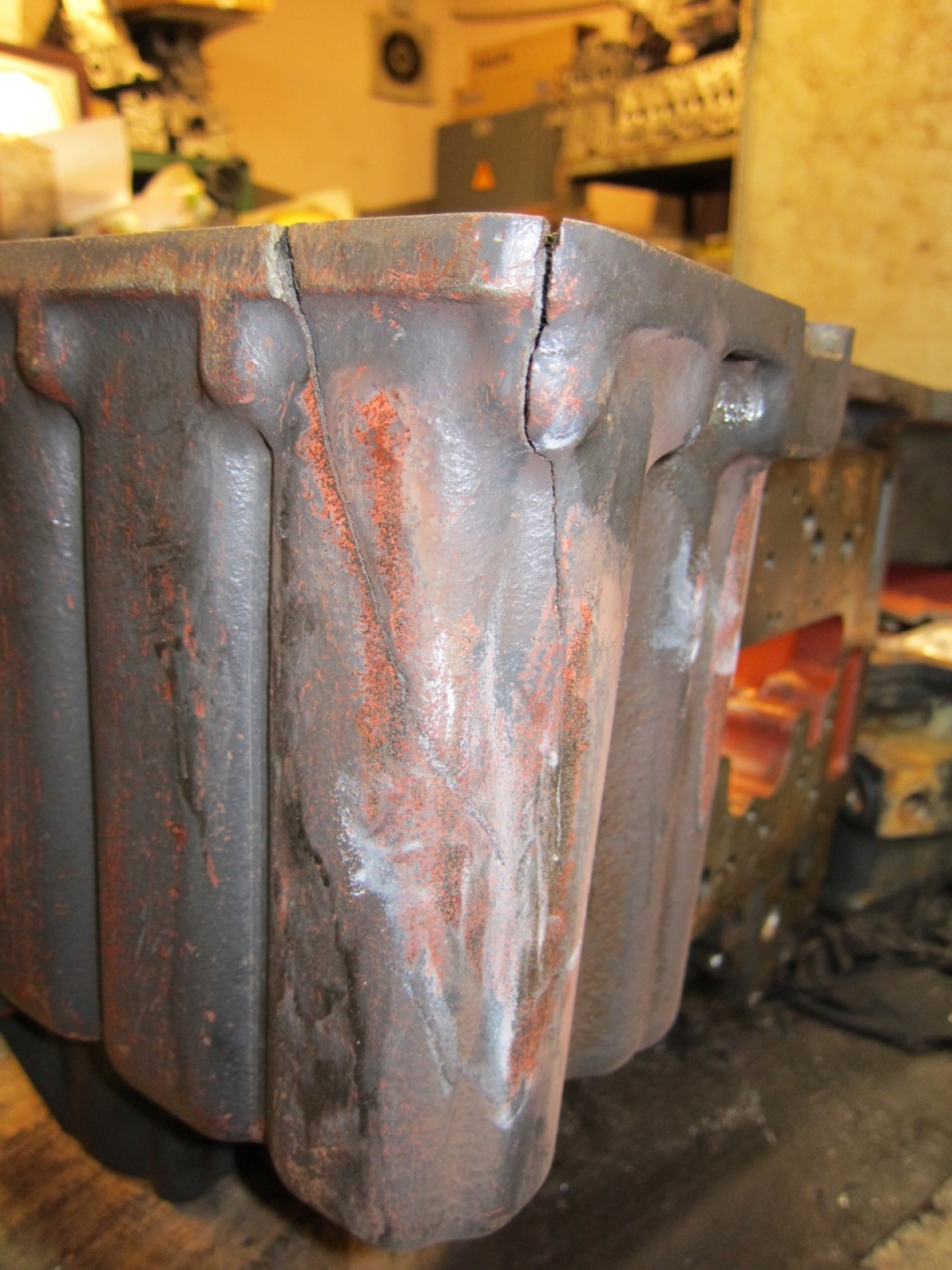 Another cautionary note – do not use this method on cracks in automobile cylinder heads or blocks. It will not work with this application! One can add a broken off bracket or stub to a cylinder block corner or fill heavy corrosion pitting in cast iron automotive cylinder heads with Flame Powder Spray, but it is best to stay away from cracks in blocks and heads with this method. Lloyds Register of Ships only approves metal stitching with pins for cracks in marine engine blocks and heads.