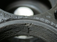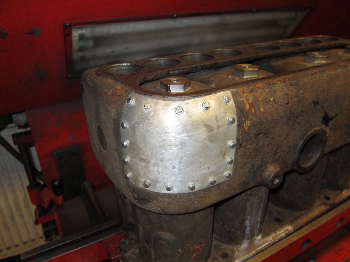 One such area is cracks between threaded valve plug holes on side valve cylinders. These can be successfully repaired using a single Lock&Stitch threaded pin, which has a “saw-tooth” thread and a “dove-tail” under the head. The repair is done by first drilling an appropriately sized hole in the middle of the crack. Then it is threaded with a “saw-tooth” tap and then the “dove-tail” recess is machined on top with a special cutter. The pin is screwed down and tightened snugly until the hex head breaks off. The final operation is machining the protruded head stub to allow for smooth finish for the valve plug copper gasket.