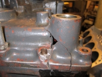 Another cautionary note – do not use this method on cracks in automobile cylinder heads or blocks. It will not work with this application! One can add a broken off bracket or stub to a cylinder block corner or fill heavy corrosion pitting in cast iron automotive cylinder heads with Flame Powder Spray, but it is best to stay away from cracks in blocks and heads with this method. Lloyds Register of Ships only approves metal stitching with pins for cracks in marine engine blocks and heads.